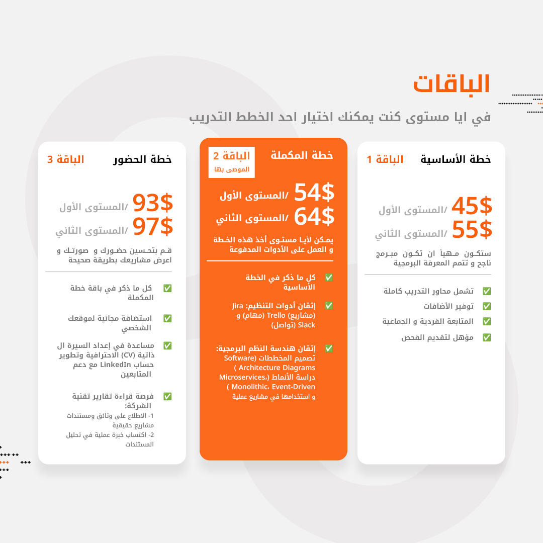 لكل مسار تدريبي مستويان، ولكي يكون التدريب مناسبًا للجميع، فعّلنا ميزة الباقات التدريبية، حيث تشمل كل باقة مجموعة من الميزات التي يمكنك الحصول عليها بسعر خاص.